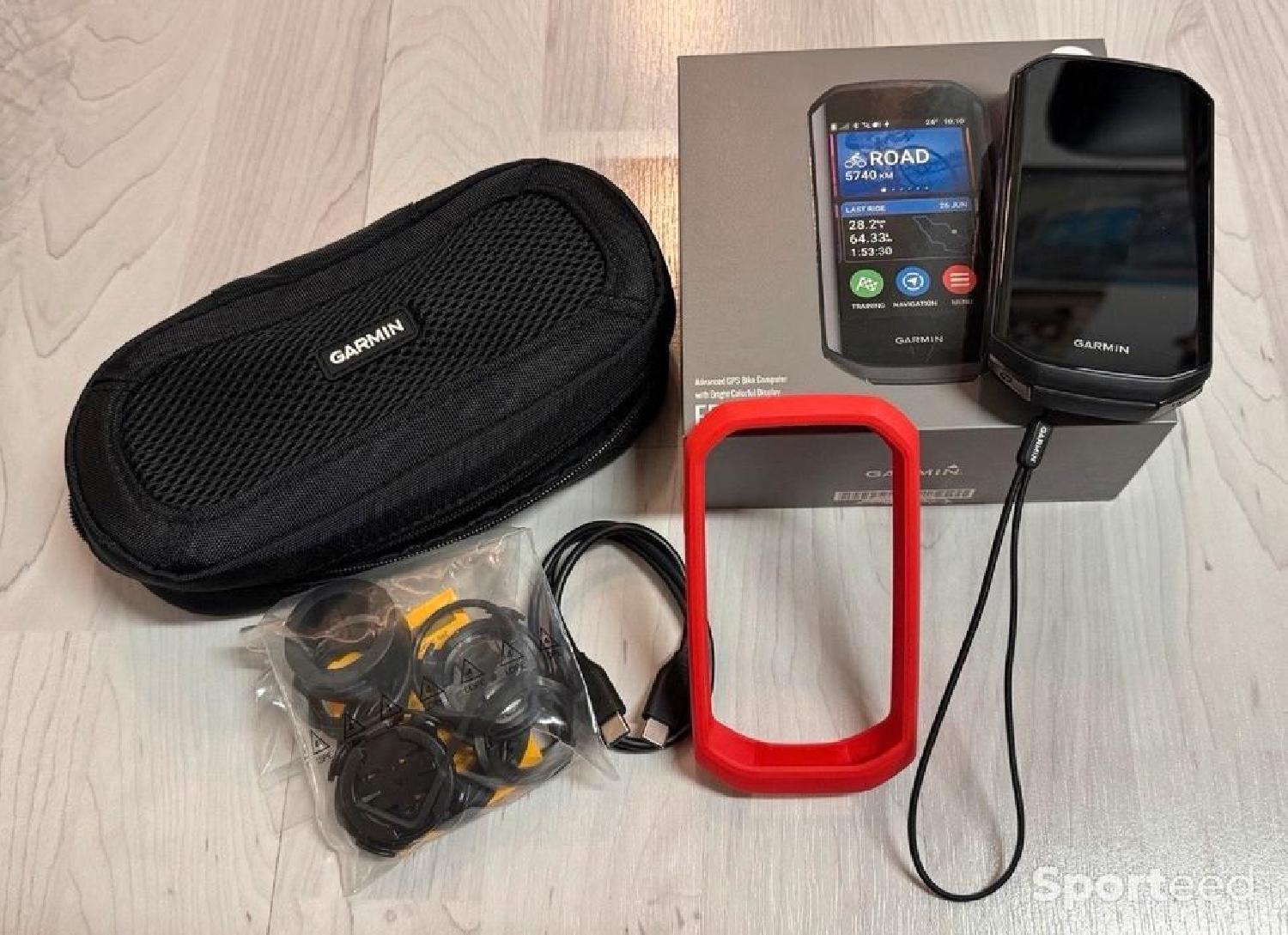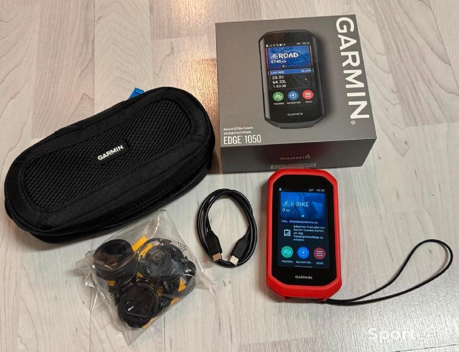 appareil comprend la boîte d'origine, le câble de chargement, une coque en silicone rouge, quelques accessoires de montage et une housse universelle noire zippée Garmin.