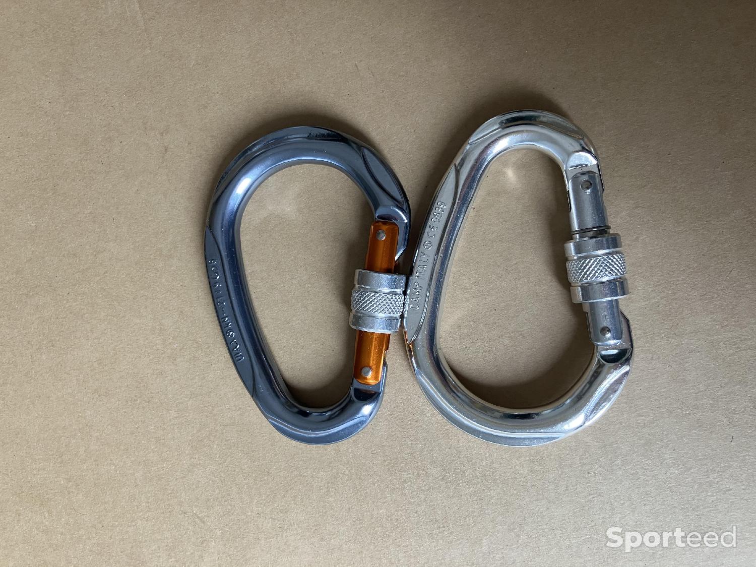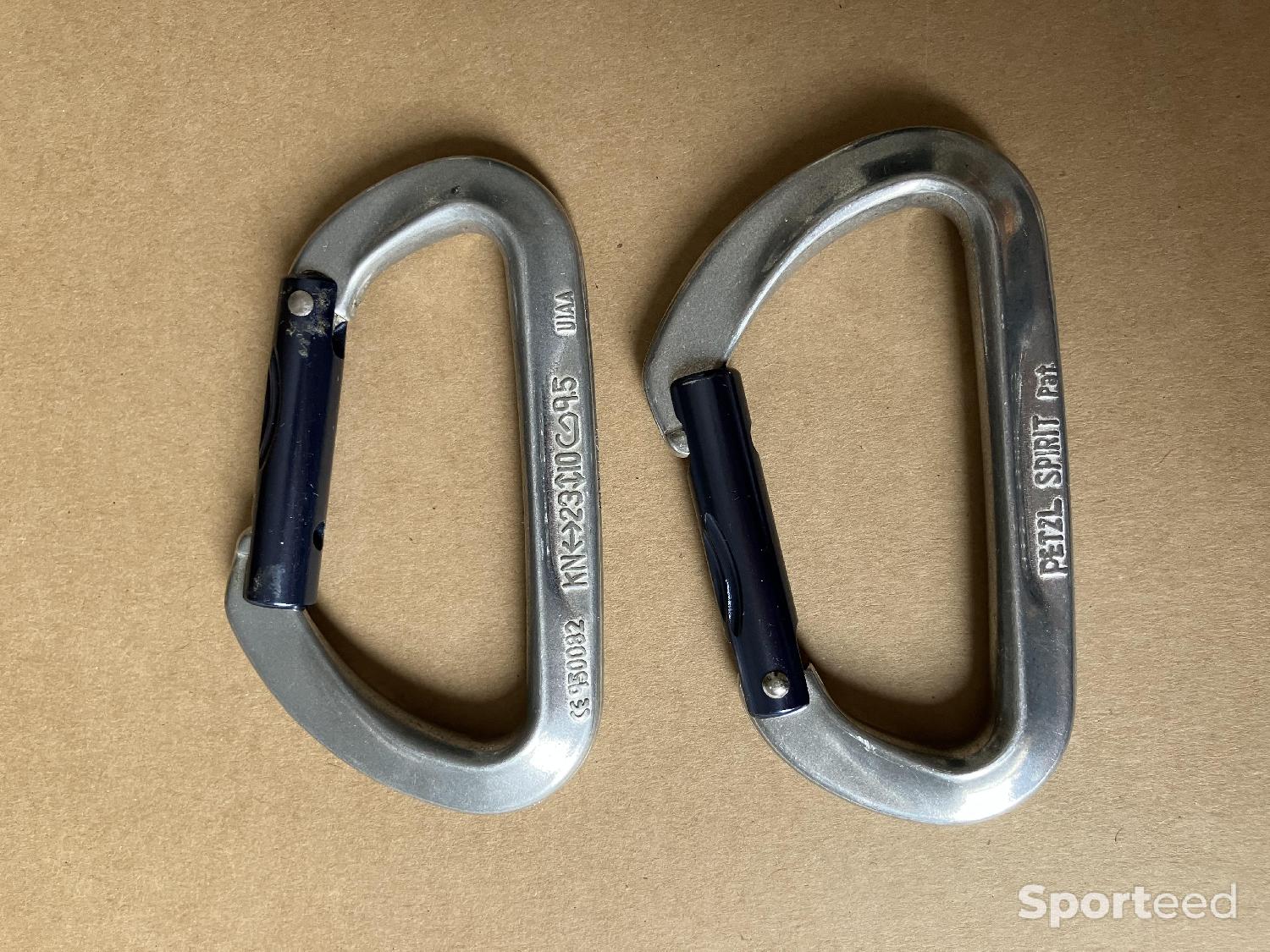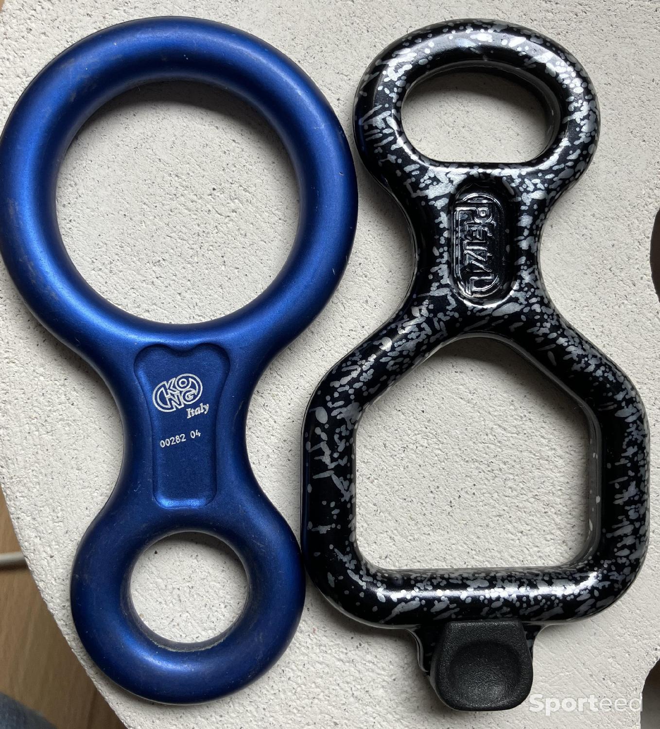 2 CAMP CE639 UIAA KN 21/9/6 - 1 KONG BONATTI CE 0474 KN 22/8/9,7. - 3 PETZL CE 09/97 KN23/76 - 2 PETZL SPIRIT CE 950082 KN 23/10/9,5. - 1 DESCENDEUR KONG 00282004 CE 040891 KN35 - 1 DESCENDEUR PETZL ANTIBRULURE CE 040891 KN35