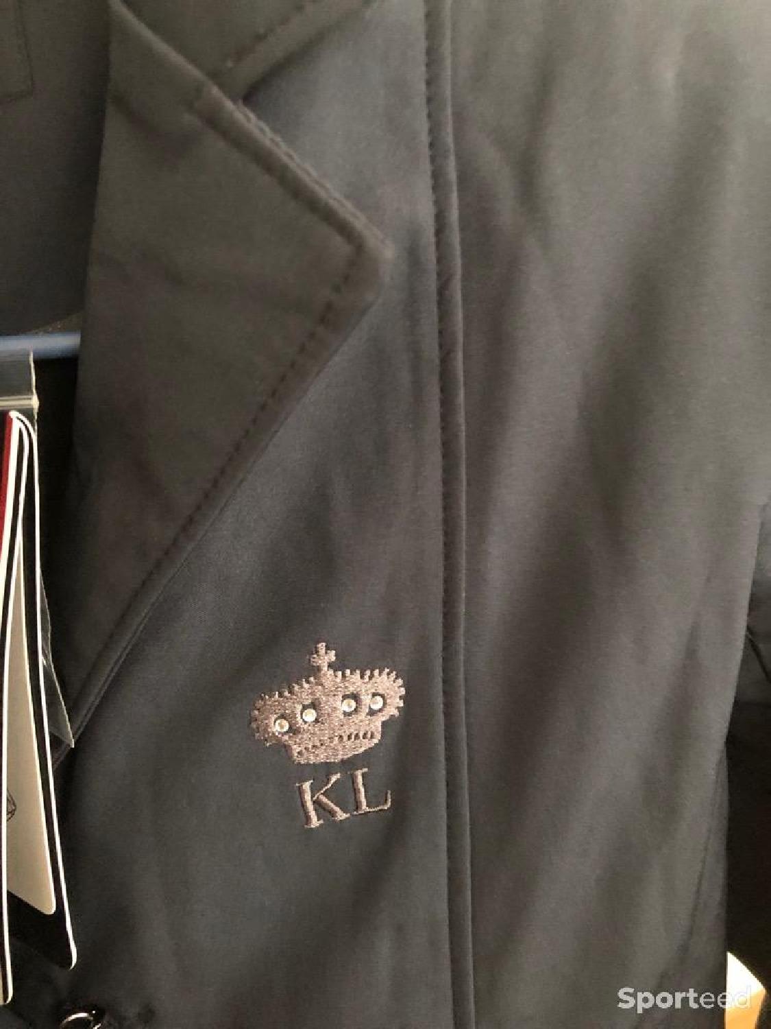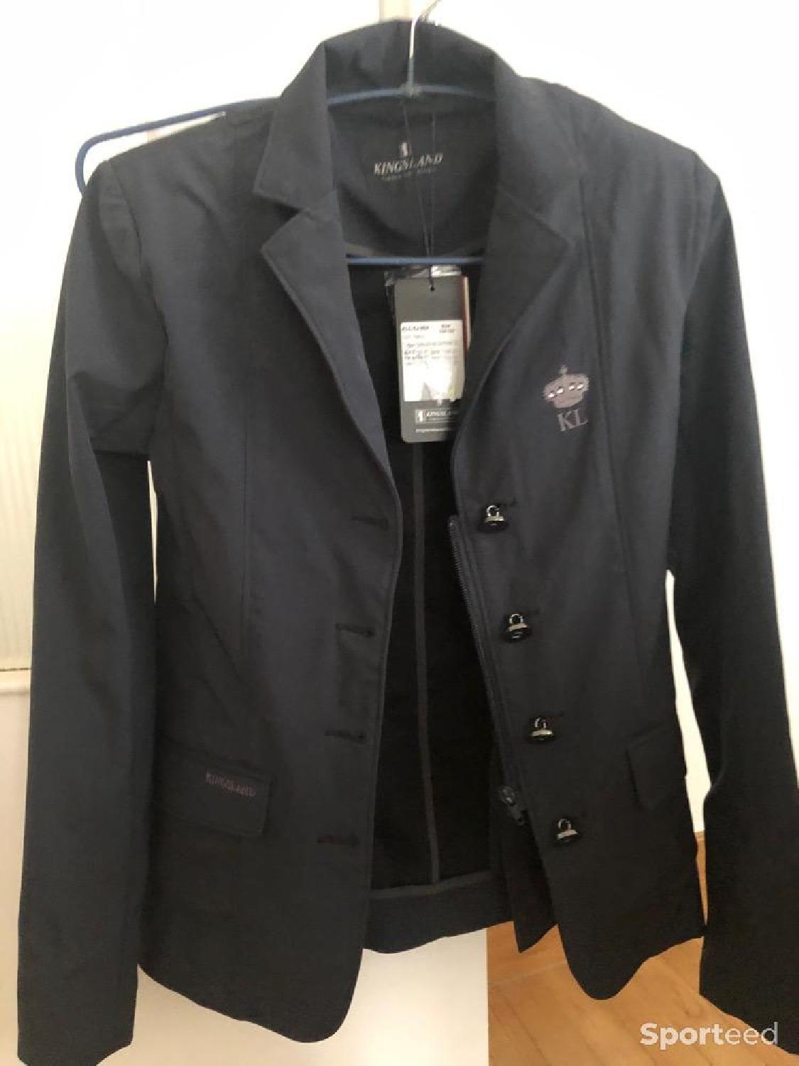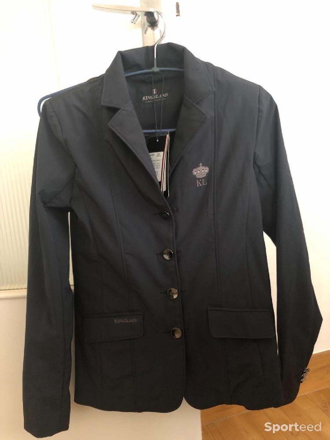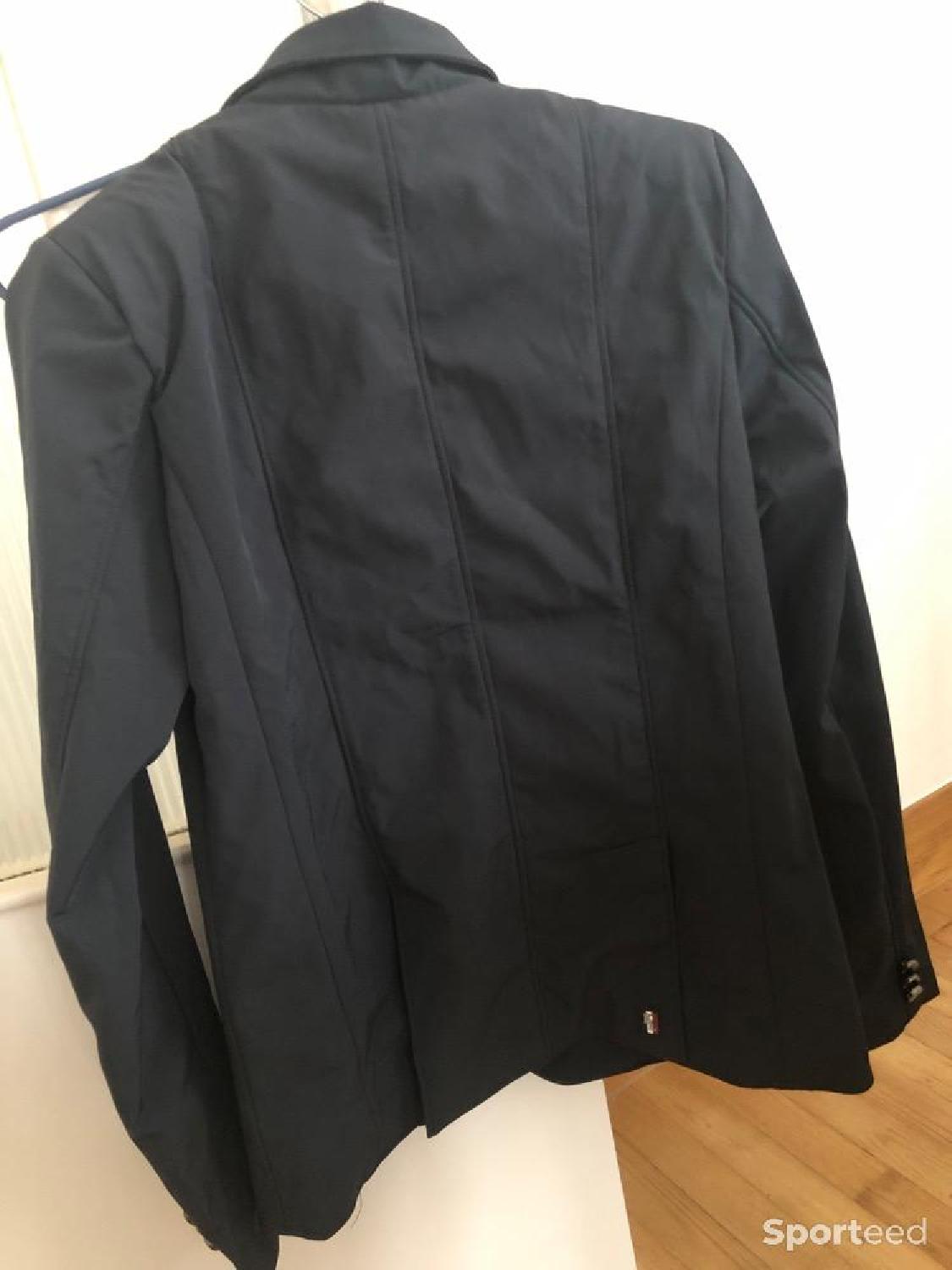 Veste de concours neuve (avec étiquette) taille 158/164. Couleur navy, cintrée, fermeture par quatre boutons et fermeture éclair, deux fentes à l’arrière.