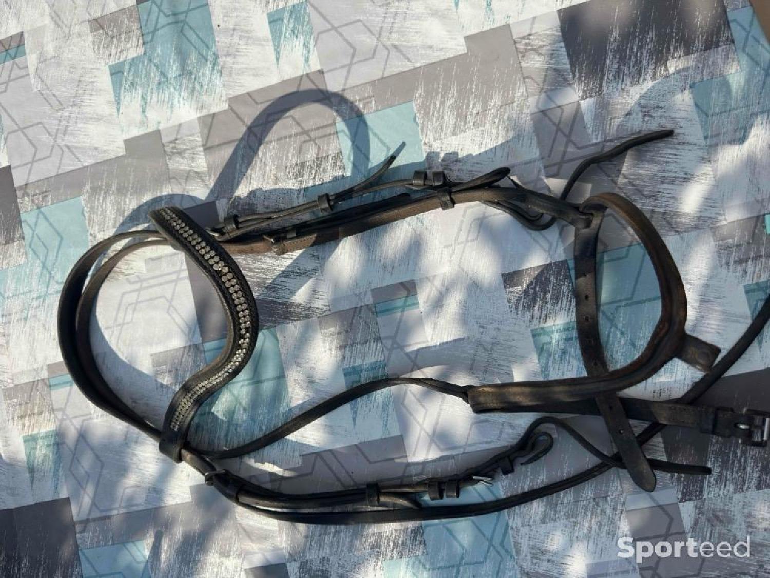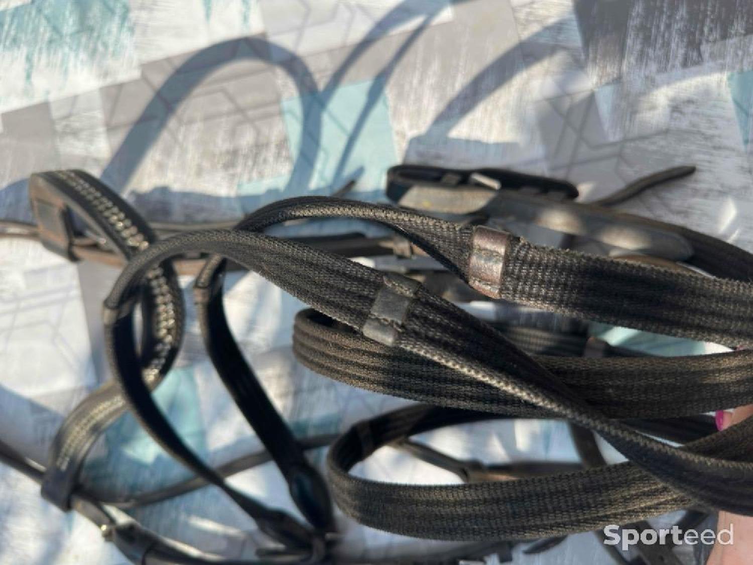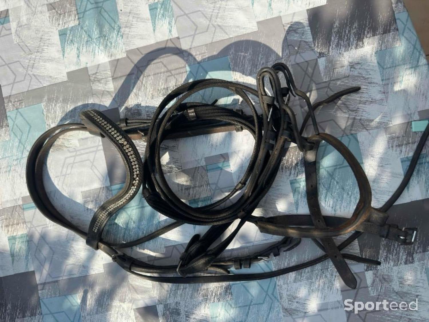 Filet noir fouganza c’était mon premier filet le frontal à perdu un peu de paillettes mais très bien pareil idéal pour poney club ou jeune pour débourrage ou quoi taille cheval vendu avec les rênes