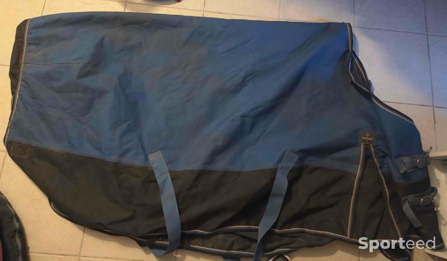 Couverture 150g 135cm bleu et noir equitheme sangle queue , cuisses , sous le ventre , attache poitrail