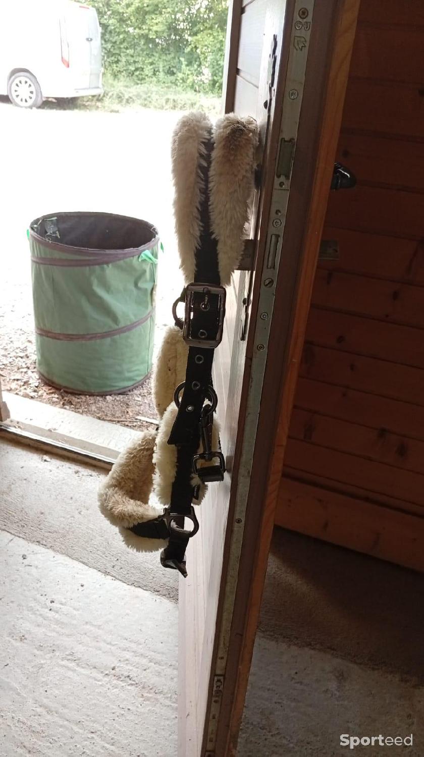 Licol taille cheval noir avec de la moumoute couleur crème en très bon état, déjà porté quelques fois