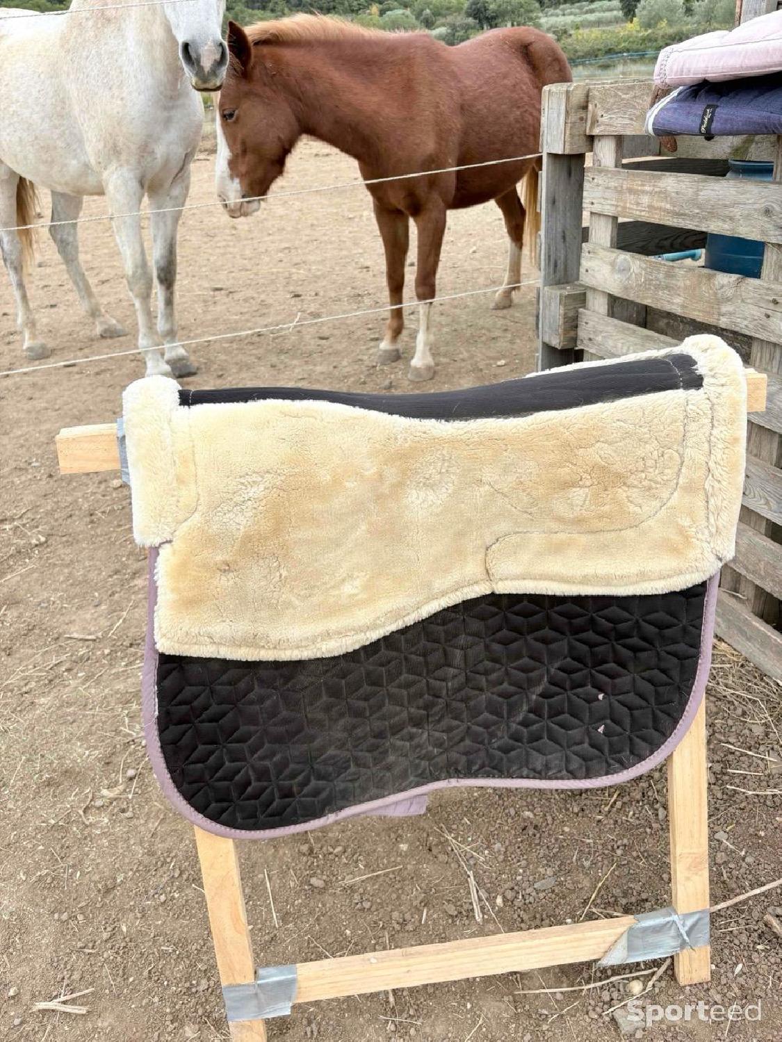 Superbe tapis Félix Bühler coloris mauve poudré, avec amortisseur intégré en mouton synthétique pour un confort optimal et une excellente répartition des pressions 🐴✨