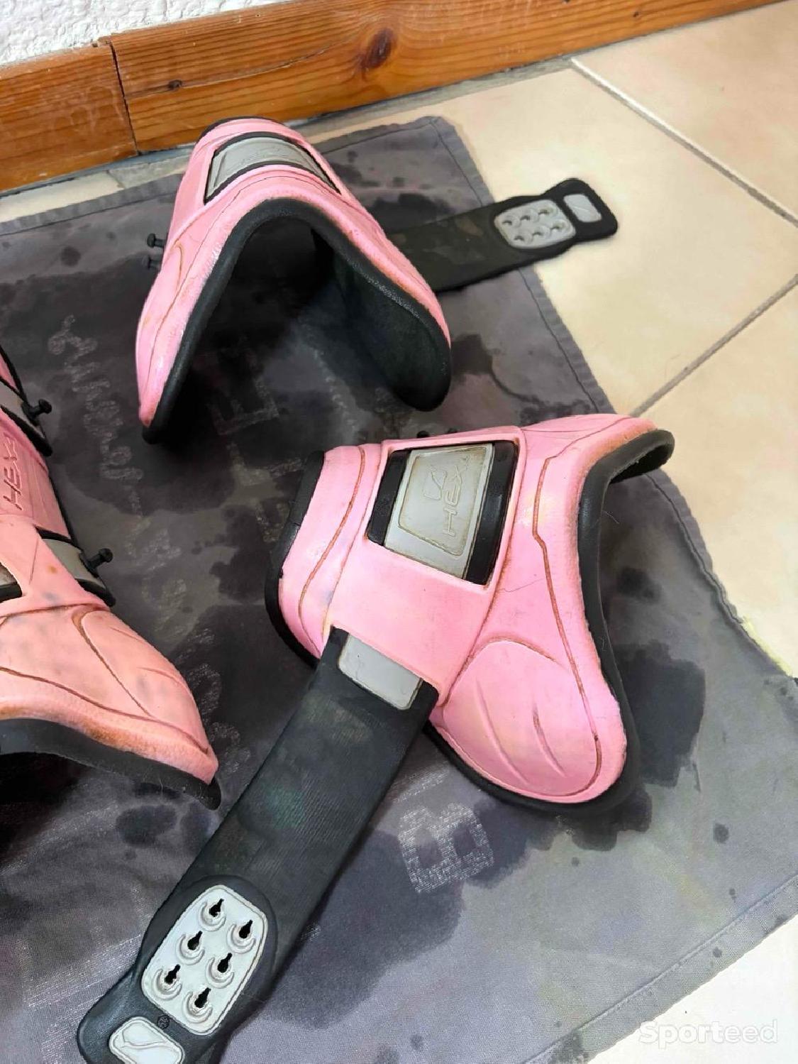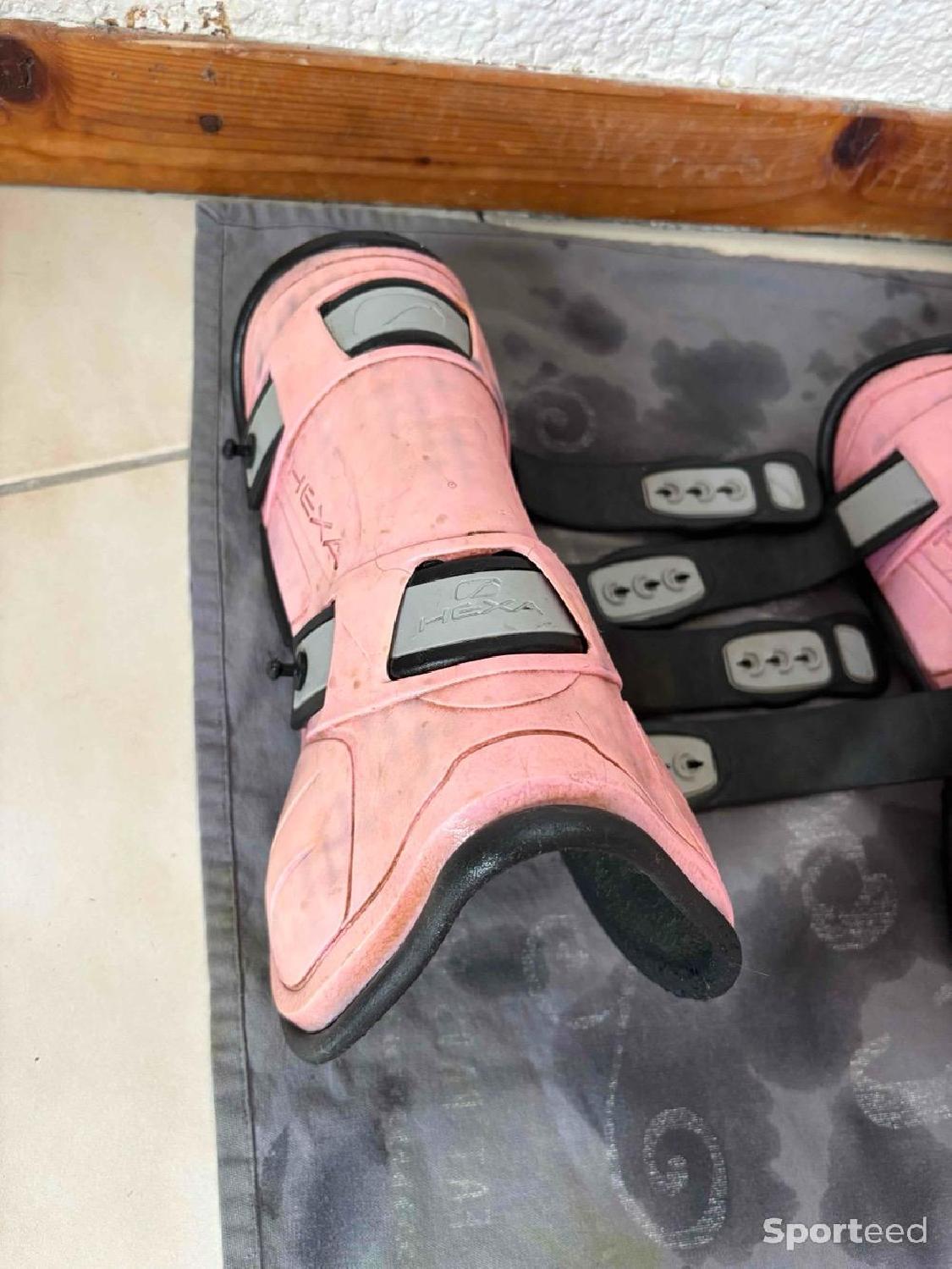 Superbe ensemble HEXA composé de guêtres avant + protège-boulets arrière, coloris rose clair, idéal pour le travail quotidien ou les séances d’obstacle 🌸