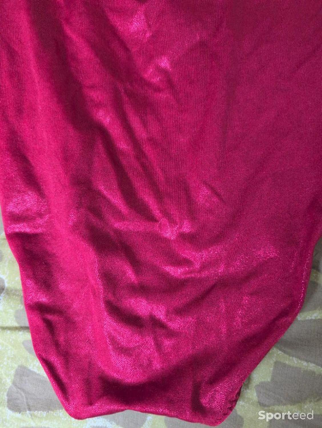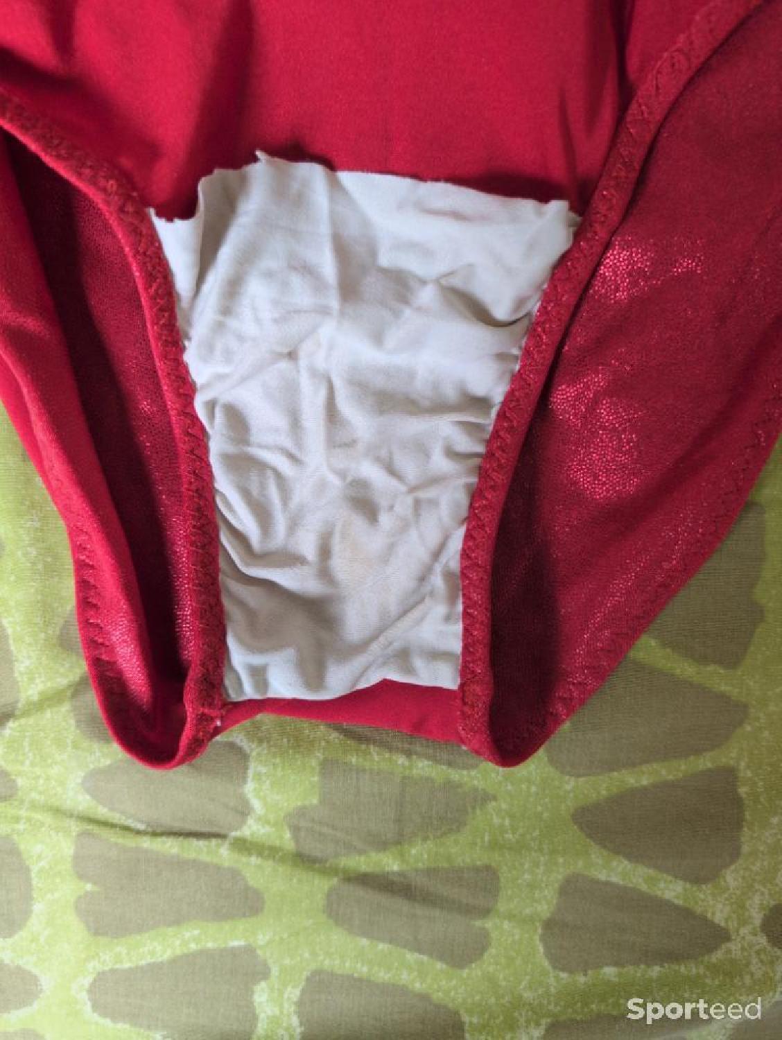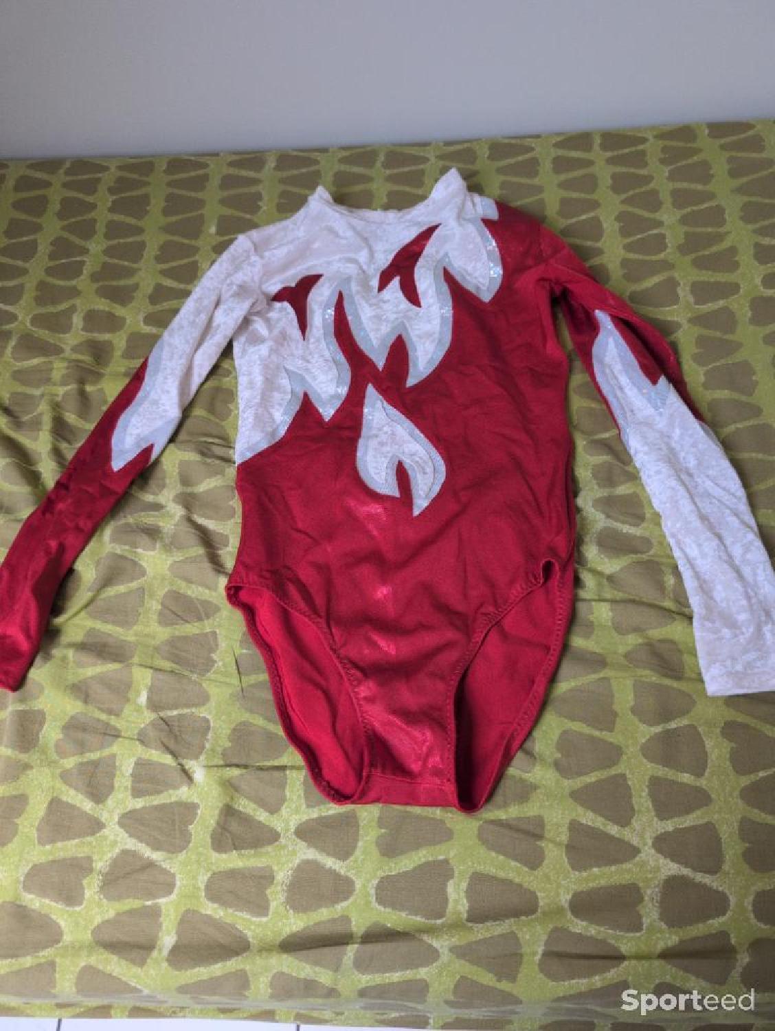 Justaucorps gymnastique rouge poudre avec flamme blanche doré aucune tâche au niveau protection hygiénique porte 1 fois lors de compétition il a été lavé a froid 2 fois lors de l achat et après la compétition