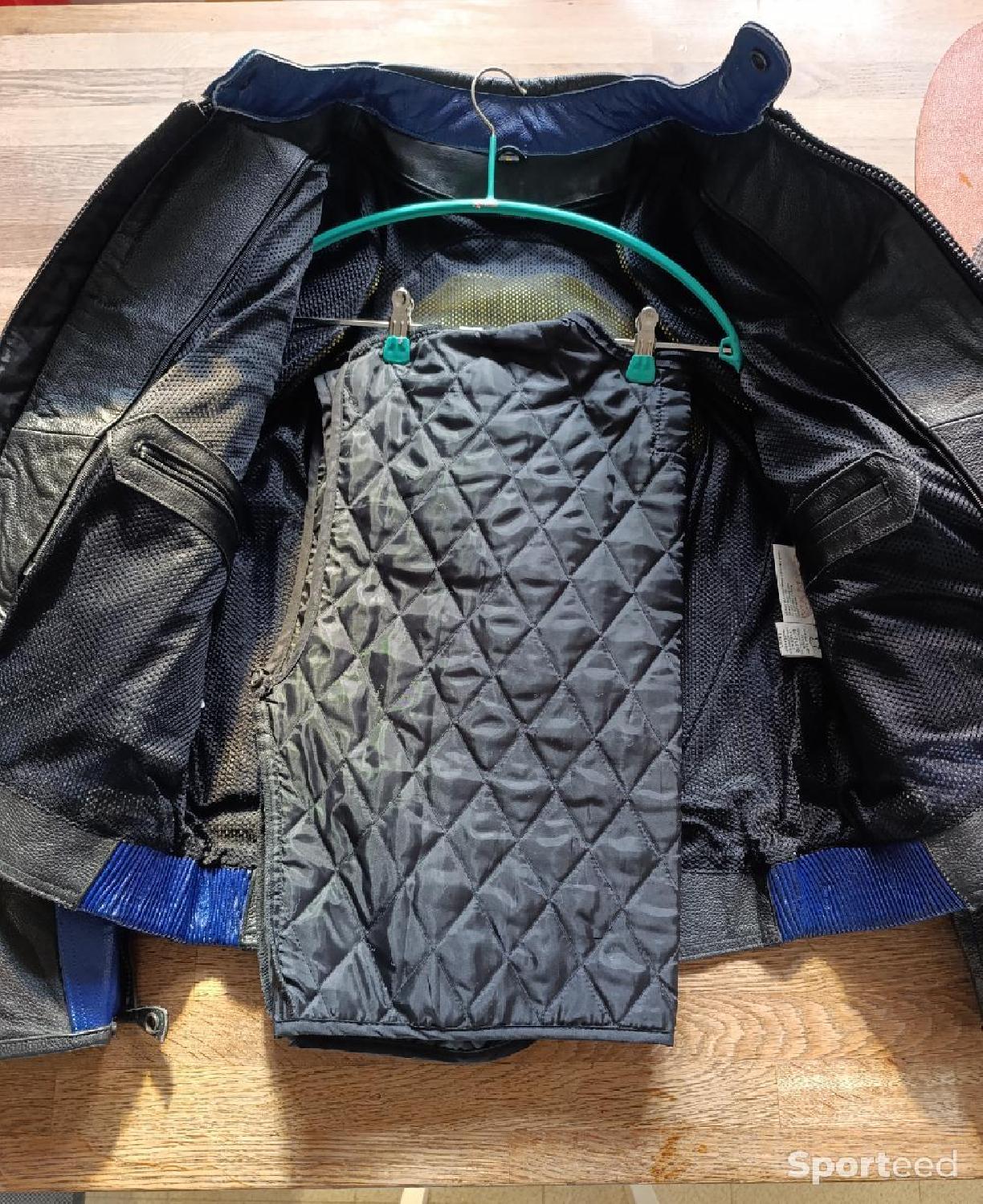 Blouson en cuir avec sa doublure de couleur noir/bleu très peu porté de taille L juste un défaut sur la fermeture éclair de la manche gauche