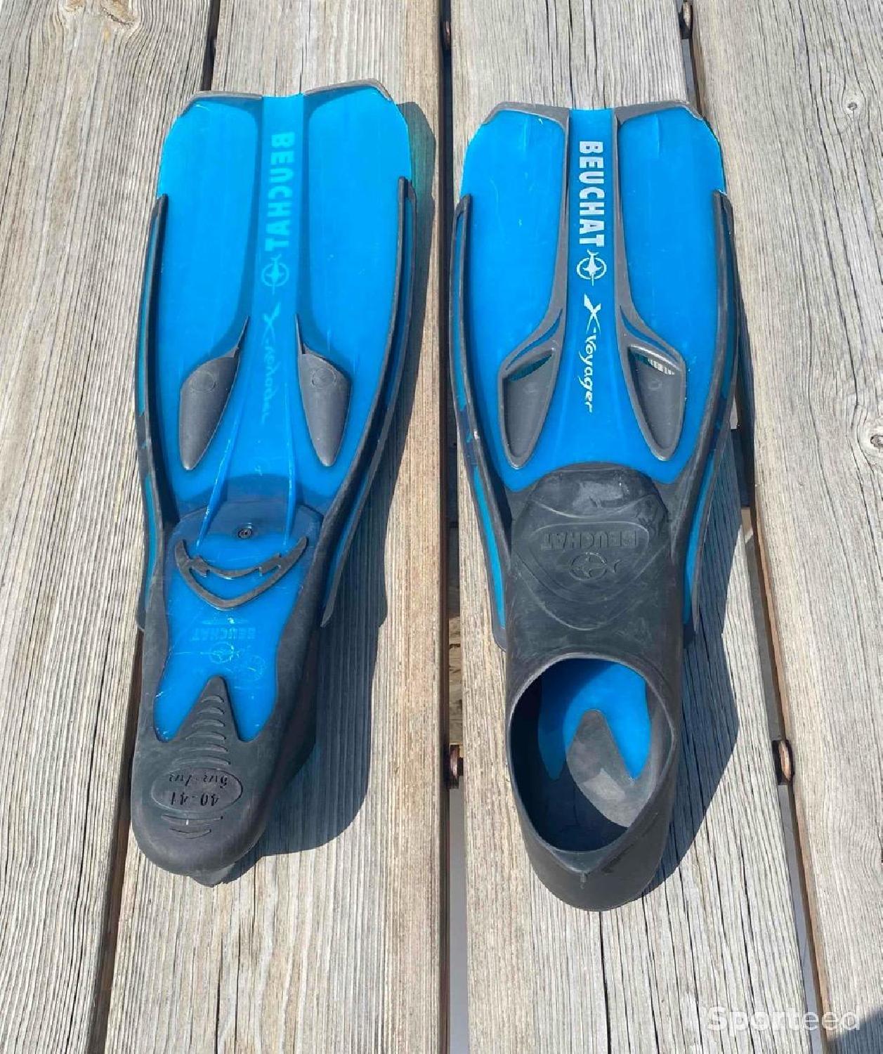 Paire de palmes Beuchat X-Voyager en bleu et noir, en bon état général avec quelques signes d'usure mineurs.