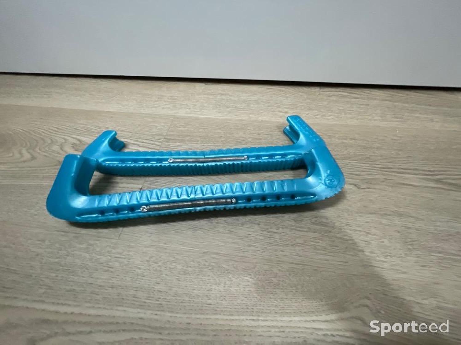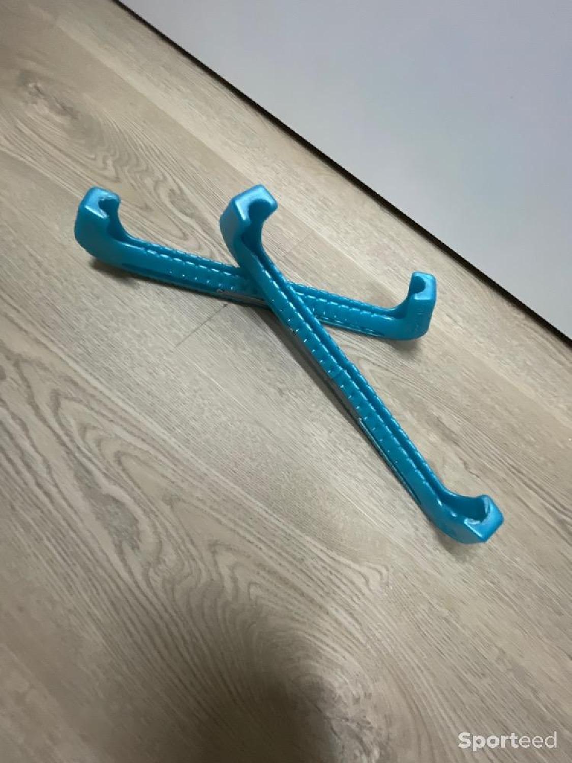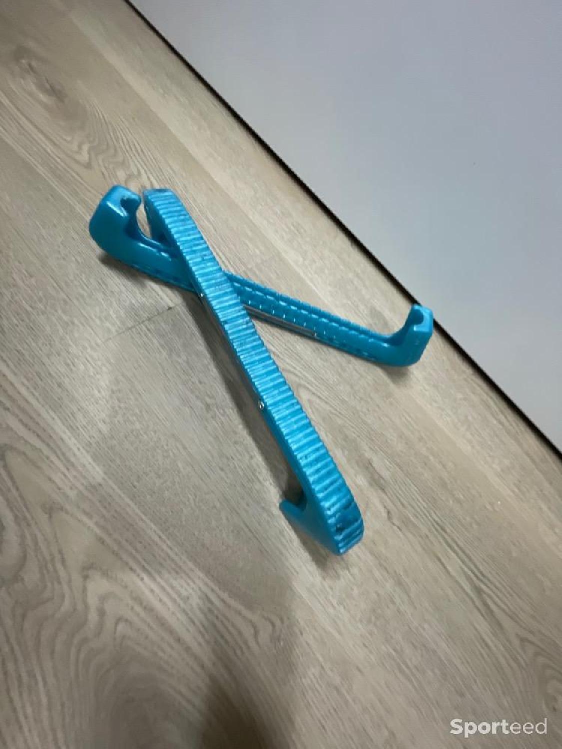 Je vends une paire de protège-lames de patinage artistique en plastique bleu clair nacré, de la marque Guardog, adapté à des patins de la taille 225 à 235. Ce sont des protège-lames rigides conçus pour marcher en dehors de la glace.
