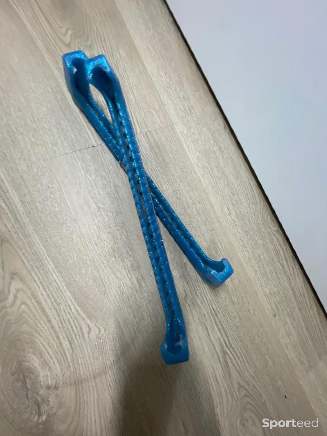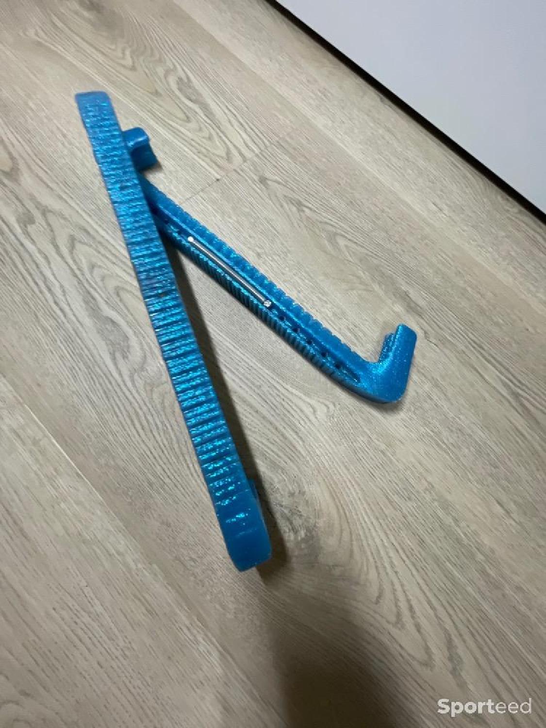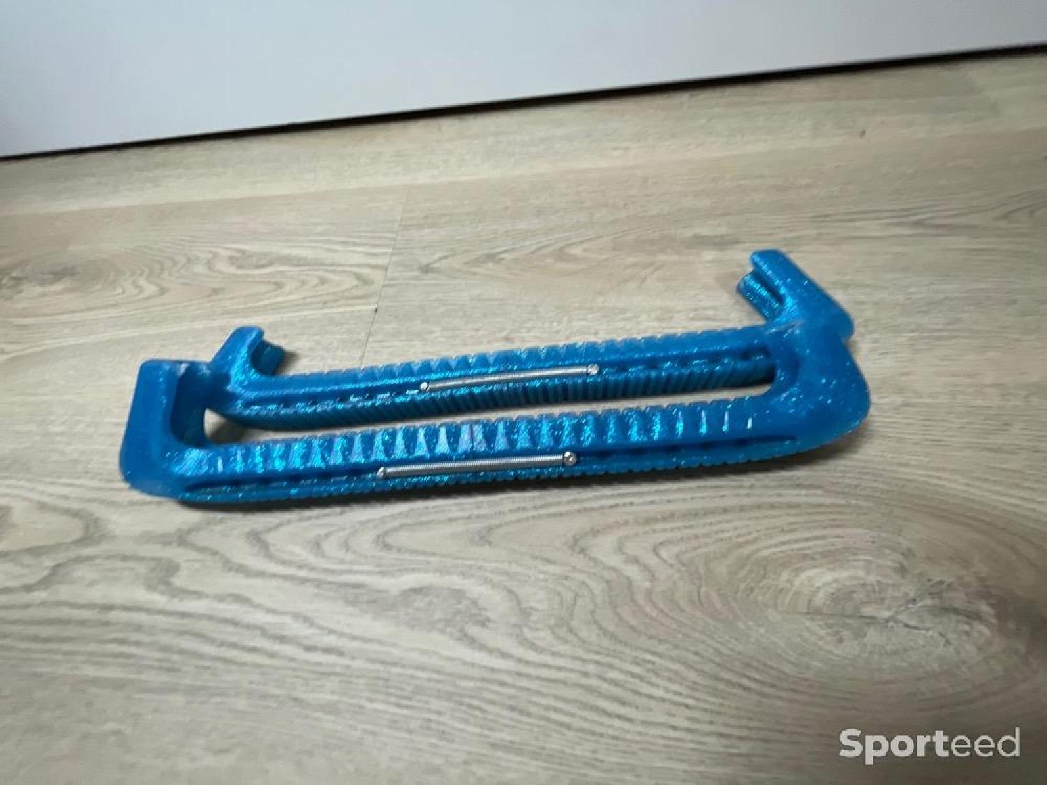 Je vends une paire de protège-lames en plastique bleu clair à paillettes de la marque Guard Dog, modèle à ressort spécialement conçu pour marcher en toute sécurité en sortant de la glace.