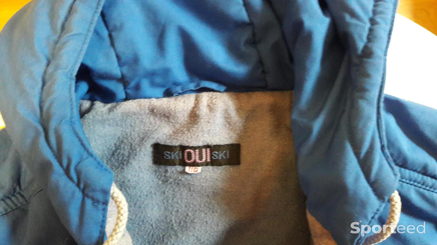 Anorak Ski Oui Ski 5 ans 110 cm (coupe cintrée), bleu avec bandes verte et blanche sur les bras.