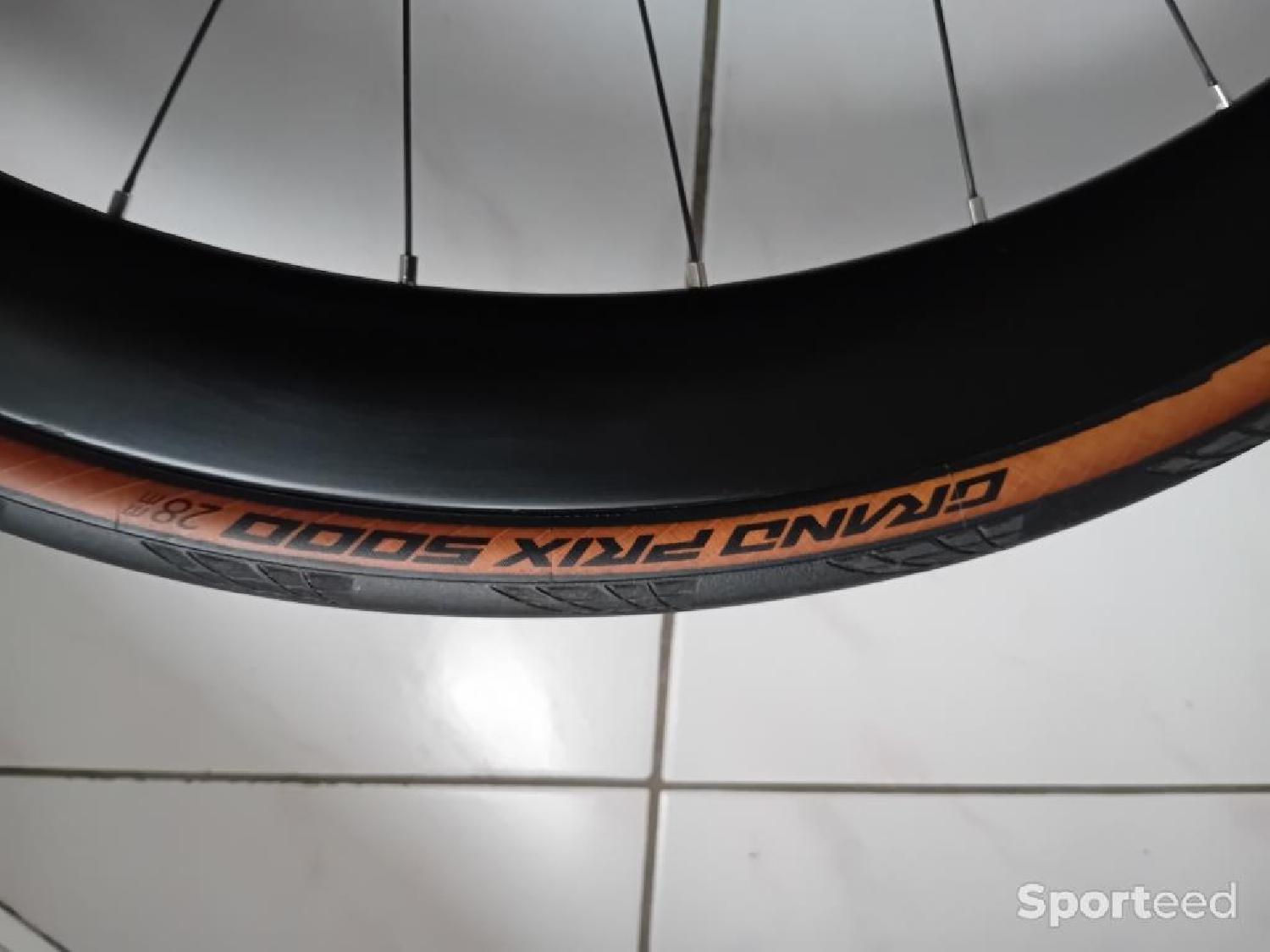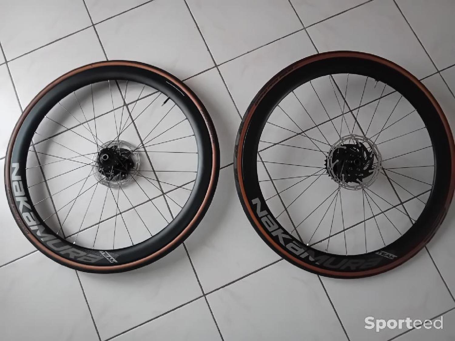 paire de roues carbone Team Nakamura 50 mn, moyeu sram 900, disques sram CLX 160, vendues avec cassette sram force 11v 10/30 et pneus continental GP 5000 en 28