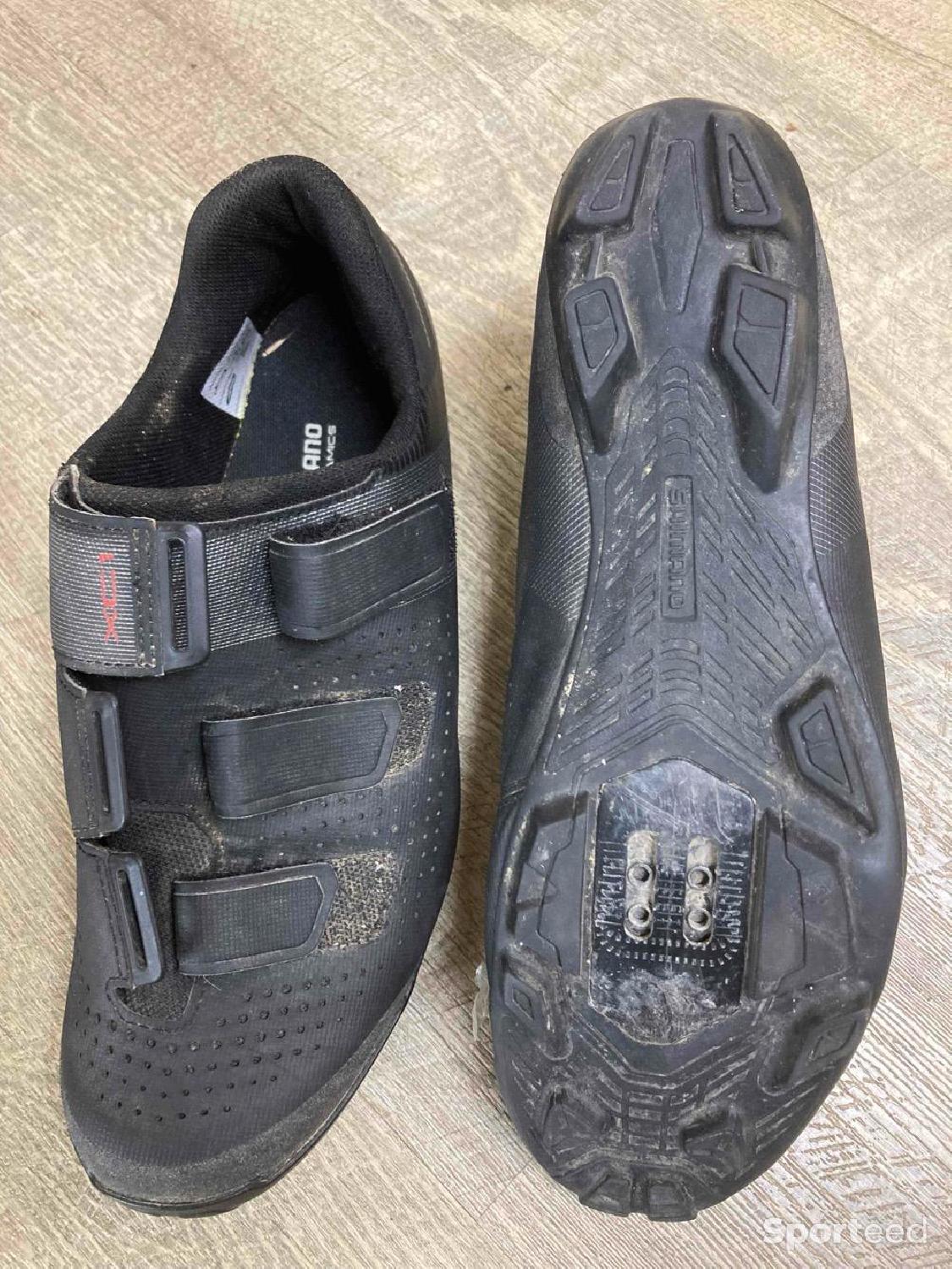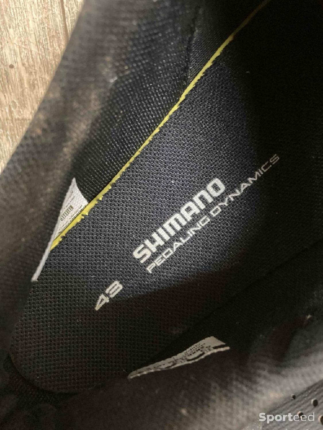 Chaussures Shimano pour cales spd (standard vtt), taille indiquée 43 mais taille vraiment petit, donc plutôt du 42.