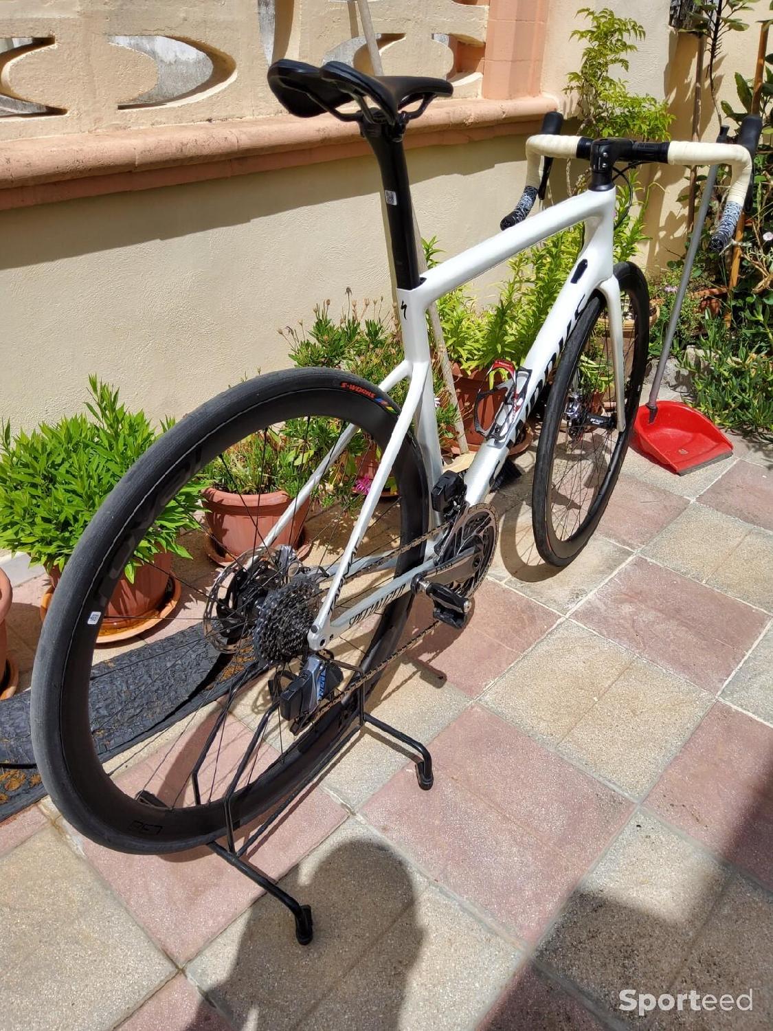 Vélo de course Specialized Tarmac SL6 S-Works, utilisé seulement deux fois, donc comme neuf, avec seulement de légères marques sur les autocollants visibles sur les photos.